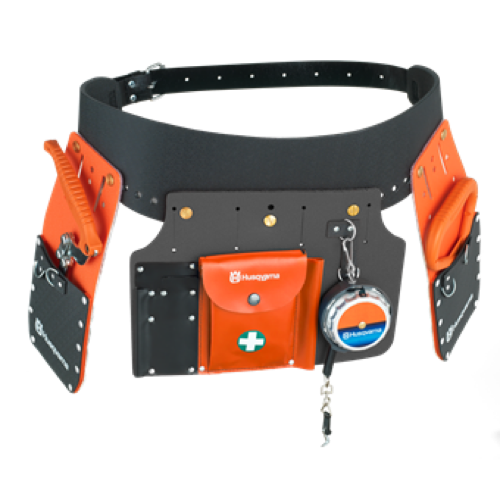 Ζώνη εργαλείων με δύο θήκες, οπίσθια φορητή εργαλειοθήκη, γάντζο ανύψωσης, λαβίδα ανύψωσης και μετροταινία.